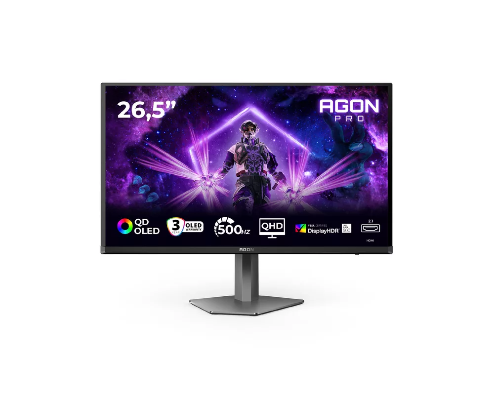Монитор AOC AG276QKD2, 26.5 inch QD-OLED, Anti-Reflection, QHD 2560x1440, 1000cd/m2, 1.5M:1, 500Hz, 0.03ms, G-SYNC Compatible, HDR500, 2x HDMI, DP, 2x USB, Speakers, Audio out, HAS, Swivel, Tilt, Pivot, VESA, Black