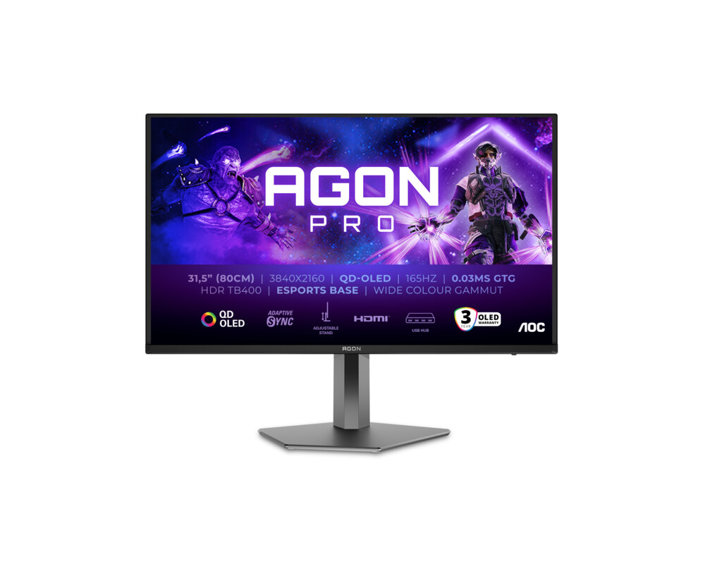Монитор AOC AG326UD, 31.5 AGON Pro Gaming monitor, QD OLED panel, 16:9, 4K UHD 3840x2160, 250cd/m2, 1.5M:1, 165Hz, 0.03ms, Anti-Reflection, Adaptive Sync, PiP +PbP, Flicker Free, Low Blue Light, 2x HDMI, DP, 3x USB, Audio out, Speakers, HAS, Swivel, Tilt, Pivot, VESA 100, Black/Grey