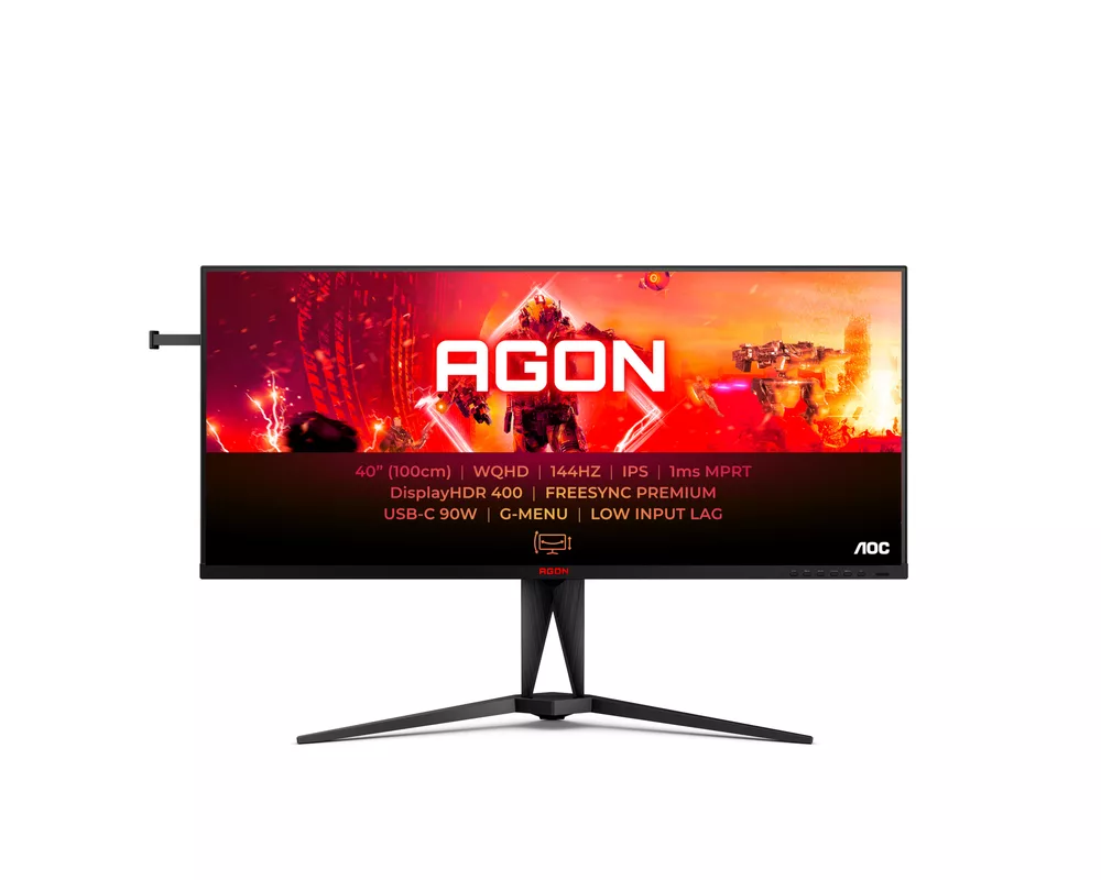 Монитор AOC AG405UXC, 40 inch Gaming monitor, IPS Panel, AG, WQHD 3440x1440, 21:9, 144Hz, 1ms, 1200:1, 80M:1, FreeSync Premium, G-Sync, HDR400, Low Input Lag, G-Menu, PbP, PiP, 2x HDMI, DisplayPort, USB-C, 4x USB, Speakers, HAS, Swivel, Tilt, VESA 100, Black