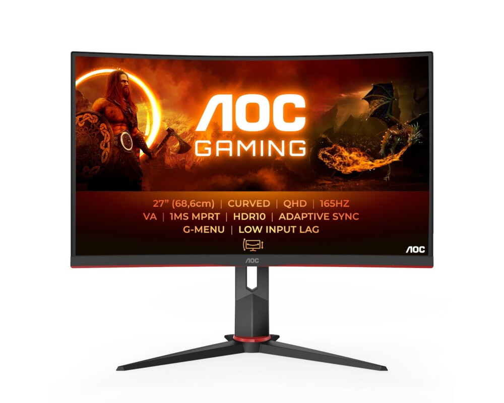 Монитор AOC CQ27G2S/BK, 27'' Gaming monitor, Curved 1500R, VA Panel, AG, QHD 2560x1440, 16:9, 250cd/m2, 4000:1, 80M:1, 1ms, 165Hz, Adaptive Sync, HDR 10, Low Blue Light, Flicker Free, 2x HDMI, DisplayPort, Audio out, Tilt, HAS, Swivel, VESA 100, Black