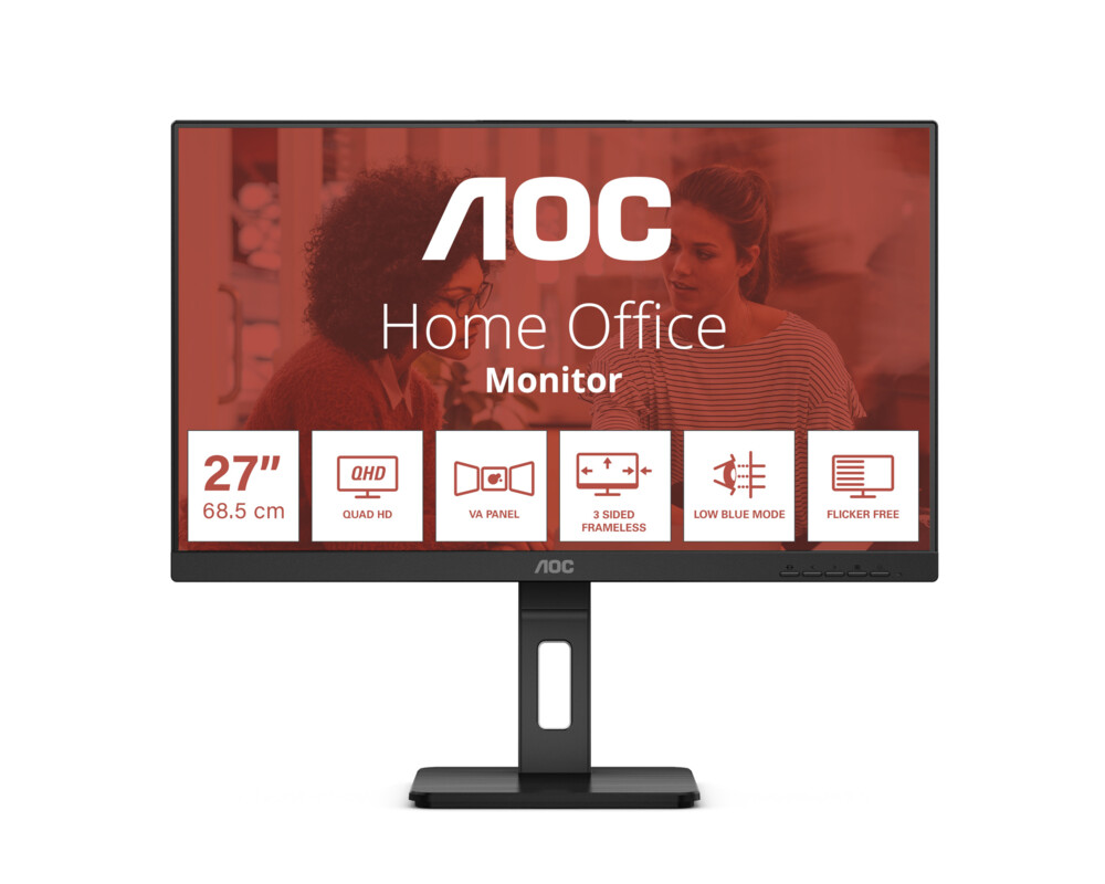 Монитор AOC Q27E3UMF, 27'', WLED VA Panel, 2560x1440, 16:9, 4ms, 300 cd/m2, 4000:1, 20M:1, Anti Glare, 3H, 3-sided frameless, Flicker-free, Low blue light, AdaptiveSync, HDMI, DisplayPort, 2x USB 3.2, Speakers, HAS, Swivel, Tilt, Pivot, VESA 100, Black