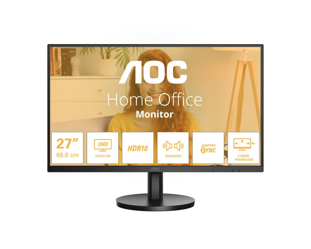 Монитор AOC U27B3A, 27'', IPS WLED panel, Anti-Glare, UHD 3840x2160, 16:9, 60Hz, 4ms, 350 cd/m2, 1000:1, 20M:1, HDR10, Flicker Free, Low Blue Light, Adaptive Sync, 2x HDMI, DisplayPort, Audio Out, Speakers, Tilt, VESA 100, Black