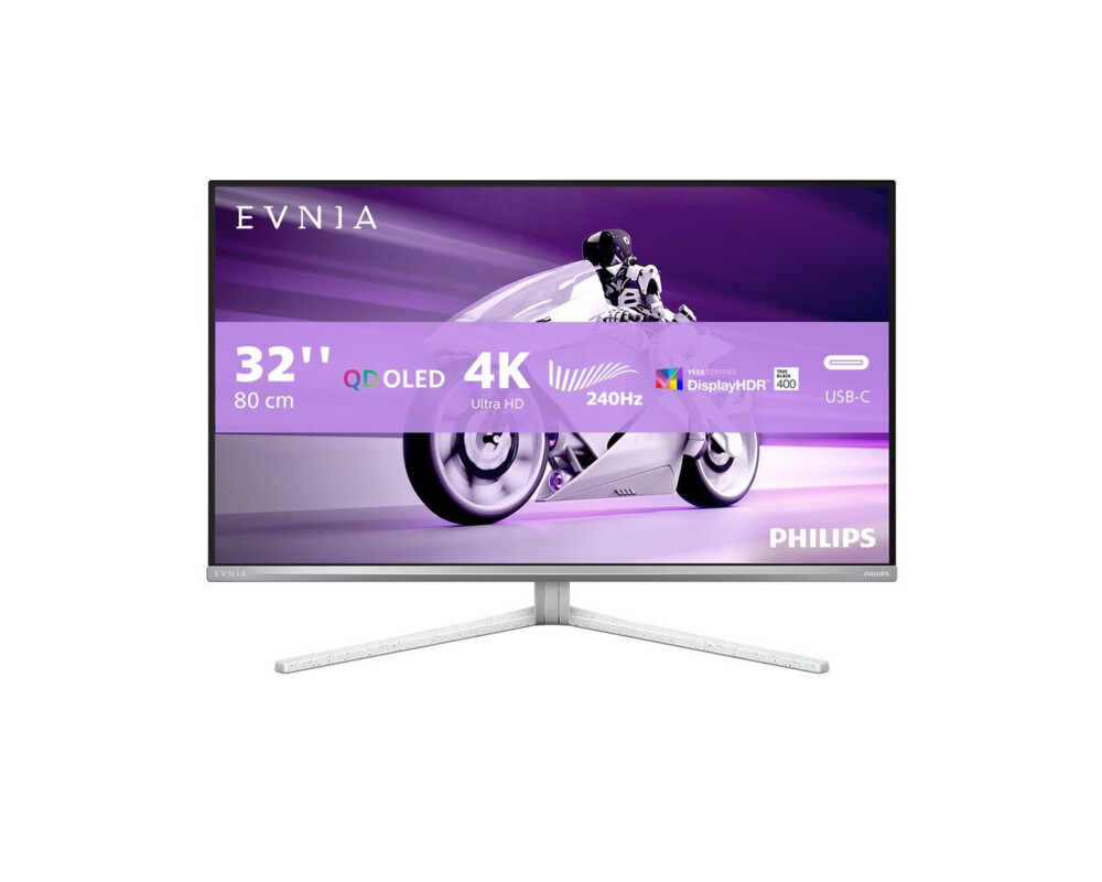 Монитор Philips 32M2N8900/00, 31.5'' EVNIA gaming monitor, QD OLED panel, 16:9, AR, 4K UHD 3840x2160, 450cd/m2, 1.5M:1, 0.03ms, 240Hz, DisplayHDR True Black 400, Ambiglow, Adaptive sync, Flicker-free, 2x HDMI, DP, USB-C, 2x USB, Audio out, KVM, Speakers, HAS, Swivel, Tilt, VESA100, White