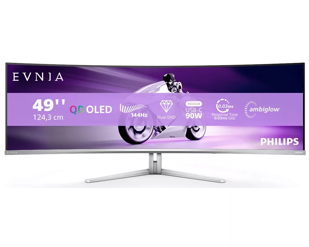 Монитор Philips 49M2C8900L/00 48,9'' EVNIA curved gaming monitor, QD OLED panel, AG, 32:9, 5120 x1440, 144Hz, 0,03ms, 450cd/m2, 15000000:1, HDR 400, VESA ClearMR 8000, FreeSync Premium Pro, Ambiglow, KVM, DTS Sound, 2x HDMI, DP, USB-C, 4x USB, HAS, Swivel, Tilt, Speakers, VESA 100