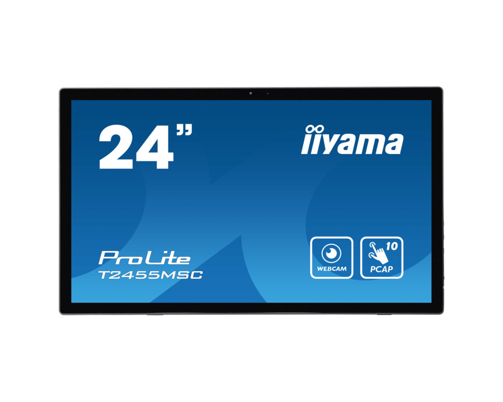 Монитор IIYAMA T2455MSC-B1, 23.8'' IPS Panel, Projective Capacitive 10 points touch, 16:9, 1920x1080, 5ms, 350cd/m2, 1000:1, Anti-Fingerprint, 7H, Palm rejection, Webcam and Microphone, Blue light reducer, Flicker free, HDMI, DisplayPort, 2x USB, Speakers, Tilt, VESA 100, Black