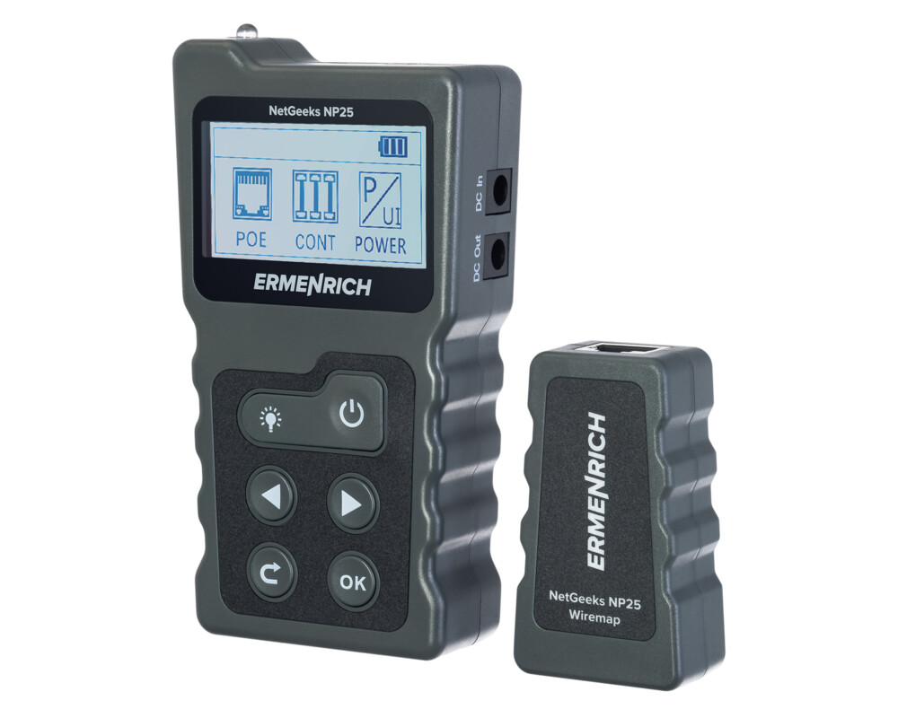 <p>Устройството включва предавател и дистанционно устройство. Предавателят се нуждае от три стандартни батерии (не са включени). Компактен и лек Ermenrich NetGeeks NP25 се управлява лесно само с няколко бутона. Резултатите от измерването се показват на вградения течнокристален дисплей с фоново осветление. Подходящ за проверка на STP/UTP кабели (CAT5, CAT6), телефонни кабели. Дължината на кабелите, които се проверяват, не трябва да бъде по-голяма от 600 метра.</p>
