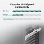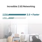 2.5G Base-T е обратно съвместим с множество скорости на данни, включително 2,5 Gbps, 1 Gbps, 100 Mbps и 10 Mbps Base-T свързаност. 2.5G Ethernet портът автоматично преговаря между връзки с по-висока и по-ниска скорост, което ви позволява да надстроите до 2.5G мрежа плавно.