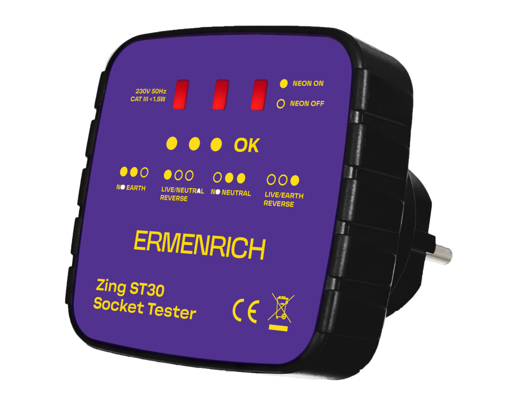 <p>Тестерът за захранващи контакти Ermenrich Zing ST30 е предназначен за проверка дали всички захранващи контакти са правилно свързани и за проверка на напрежението. Тестерът трябва да бъде включен директно в захранващия контакт, а мигането на светодиода показва различни електрически неизправности: липса на заземяване/липса на нула, размяна на фаза/нула или размяна на фаза/заземяване. В допълнение специфичният цветови код, който се появява на екрана на тестера, сигнализира правилното състояние на окабеляването. Функцията на всеки код е написана на устройството.</p>