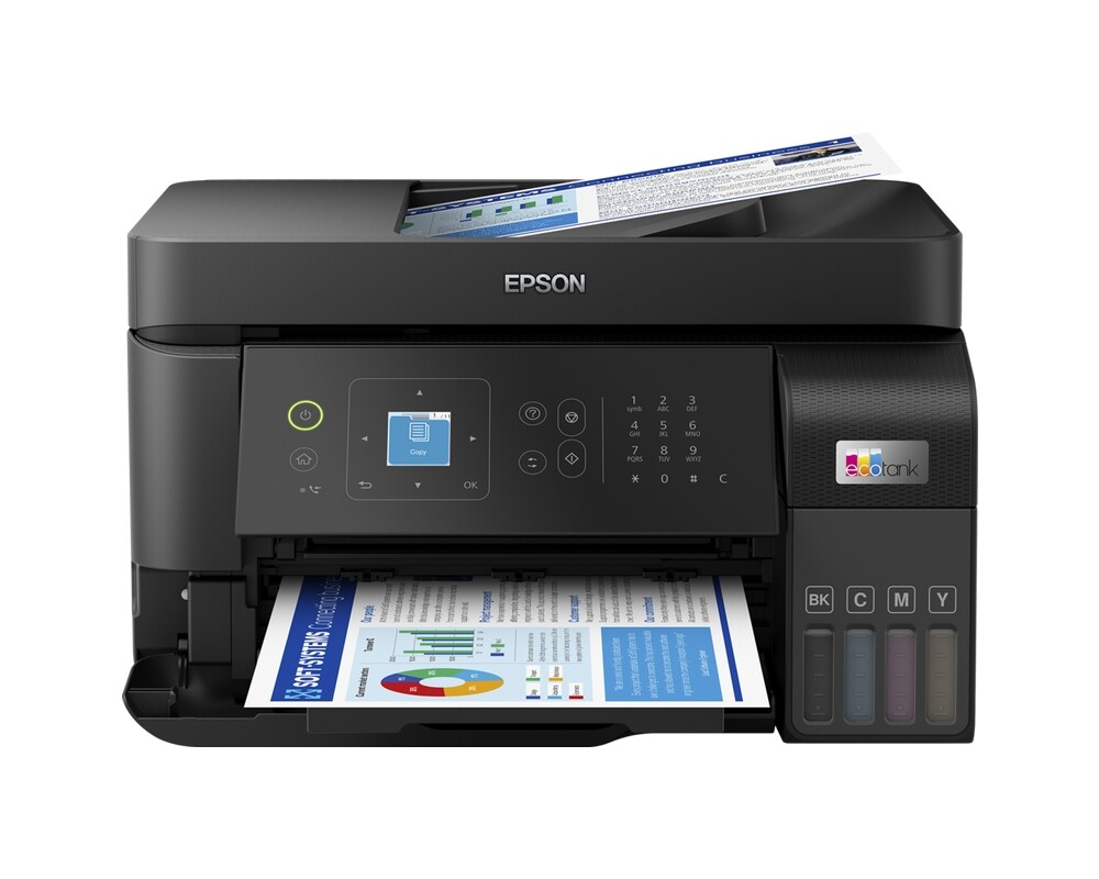 EcoTank осигурява безпроблемен печат у дома – резервоарите за мастило с ултрависок капацитет позволяват безпроблемно презареждане, а бутилките тип „ключ“ са проектирани така, че да може да се постави само правилният цвят. Този икономичен принтер Ви спестява до 90% от разходите за печат и се предлага в комплект с мастило, достатъчно за до 3 години. С един комплект бутилки с мастило можете да отпечатате до 4 300 черно-бели и 7 300 цветни страници, което се равнява на до 66 касети с мастило!? Приложение Epson Smart Panel - Това приложение Ви позволява да управлявате принтера си от своето смарт устройство. Можете да печатате, копирате или сканирате документи и снимки, настройвате, наблюдавате и отстранявате неизправности в своя принтер – от телефона или таблета си. С 3,7-см цветен LCD екран, автоматично документоподаващо устройство за 30 листа и факс, задна тава за хартия за 100 листа и скорости на печат до 15 страници в минута5, можете лесно и бързо да се справите с различни задачи. С компактен дизайн, с поддържан Apple AirPrint и връзка чрез Wi-Fi, Wi-Fi Direct и Ethernet можете лесно да интегрирате този принтер с Вашата съществуваща домашна или служебна конфигурация и да печатате от мобилни устройства, таблети и лаптопи. С технологията без нагряване PrecisionCore можете да се радвате на намалена консумация на енергия и по-малка нужда от резервни части. Печатащата глава е предварително поставена за безпроблемно инсталиране на принтера.
