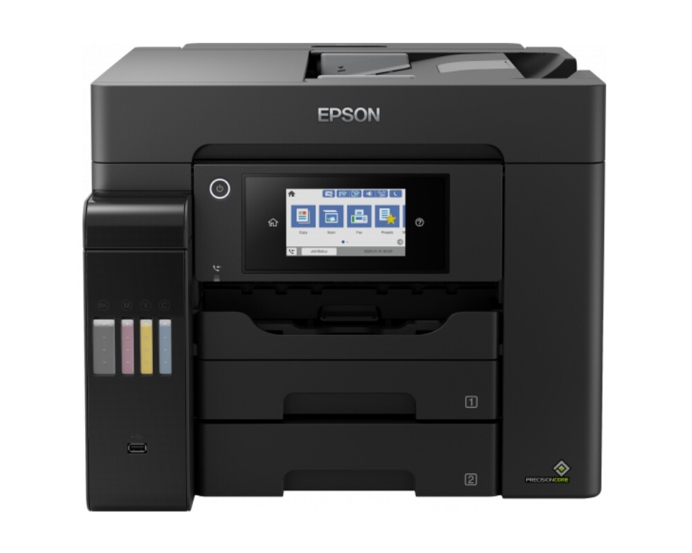 Печатът, сканирането, копирането и изпращането на факсове ще е лесно с принтер EcoTank, който осигурява изключително ниска цена на страница. Заданията могат да бъдат изпълнени бързо благодарение на високите скорости на печат и сканиране, двете предни тави с вместимост 250 листа, задното подаване за 50 листа и АДУ за 50 листа. Печатайте, както Ви харесва, с мобилен печат, Ethernet и 10,9-сантиметров LCD сензорен екран. Спечелете преднина с този бърз и ефективен принтер, който може да отпечата първата страница само за 5,5 секунди и има скорост на печат от 25 стр./мин както за черно-бял, така и за цветен печат.В съчетание с бърз двустранен печат и високоскоростно автоматично документоподаващо устройство, принтерът ще Ви помогне бързо да се справите с ежедневните задачи. Пестете всеки път, когато печатате с този EcoTank, който осигурява невероятно ниска цена на страница. За разлика от други принтери EcoTank разполага с големи резервоари за мастило, които пълните от бутилки с мастило на ниска цена. Пълненето на големите предни резервоари за мастило е лесно с бутилките, които са интуитивни, не капят и се затварят отново. Този принтер използва печатаща глава без нагряване PrecisionCore, която е известна със своята скорост, качество, надеждност и ефективност и ще издържи целия експлоатационен живот на принтера.