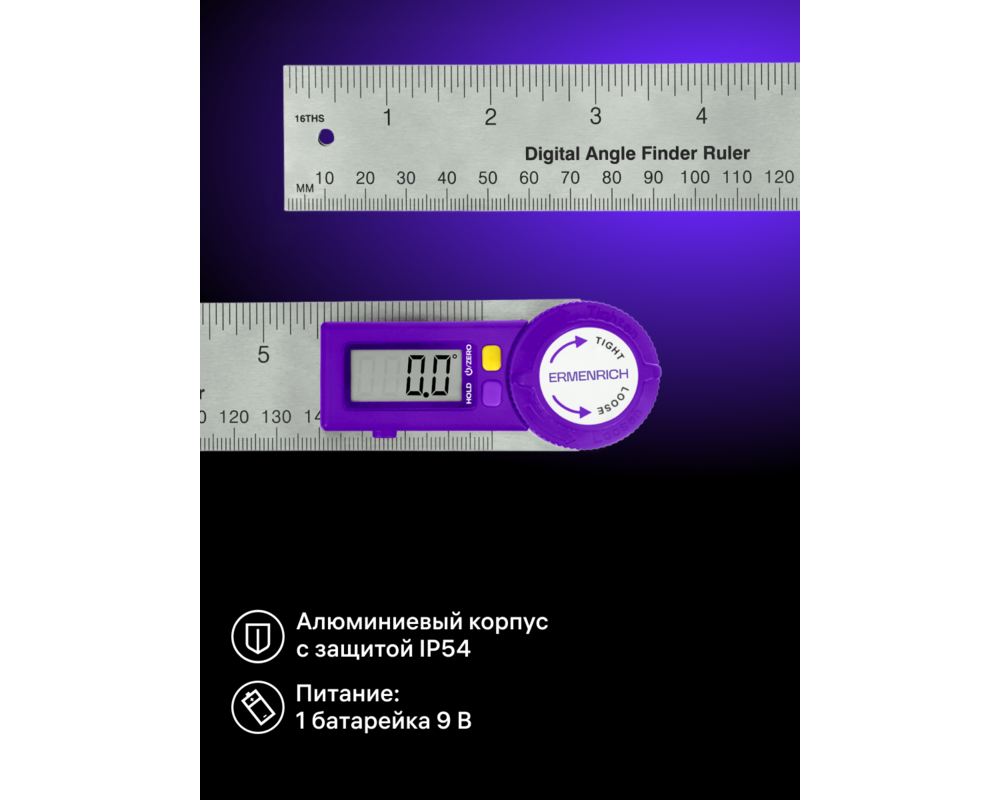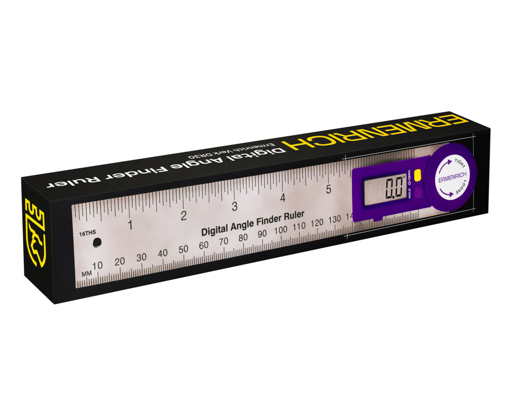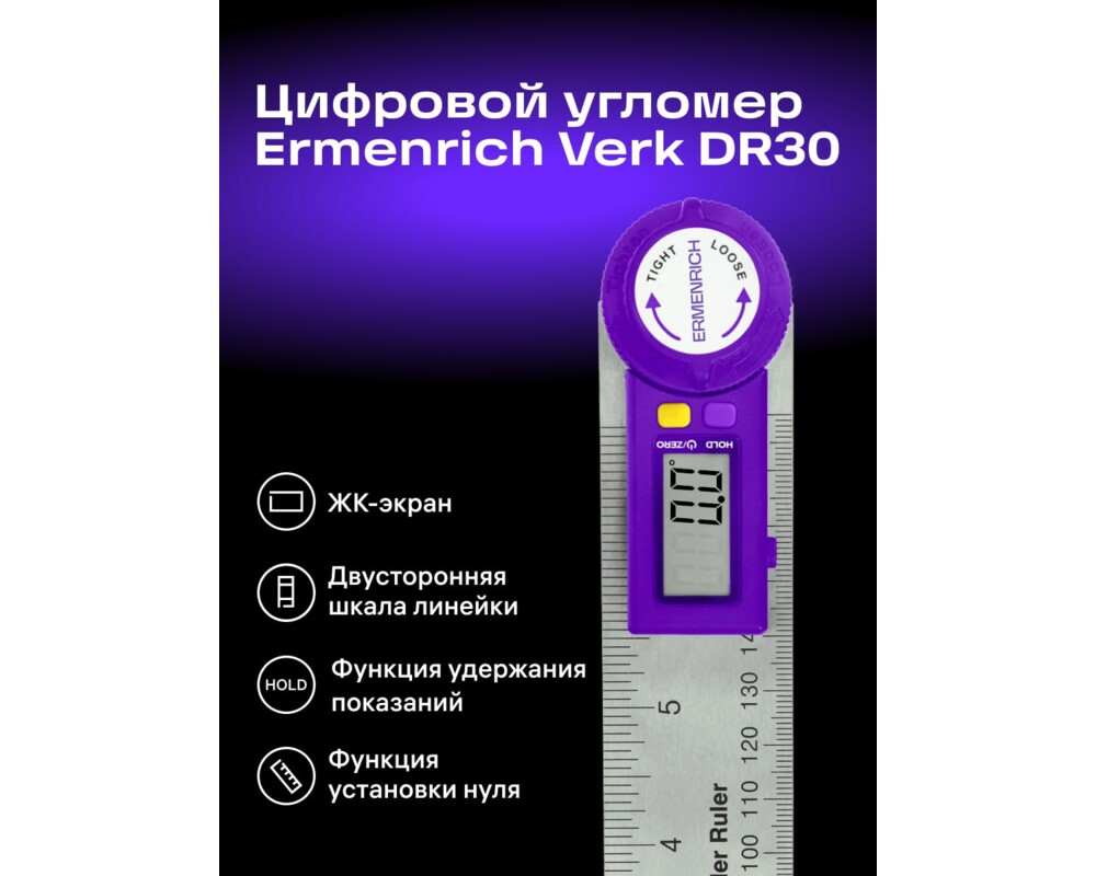 <p>Цифровият ъгломер с мерителна линия Ermenrich Verk DR30 е удобен инструмент 2 в 1, който ще Ви бъде от полза при различни ремонтни работи, в строителството, при монтажа на оборудване и мебели. Той може да измерва ъгли между равнини с висока точност (грешка само 0,3°). Може да се измерва и дължина, което е от съществено значение за маркиране на територията. Данните се показват на вградения LCD екран, а стойностите могат да се „замразяват“ с бутон за задържане. Можете също да нулирате уреда.</p>