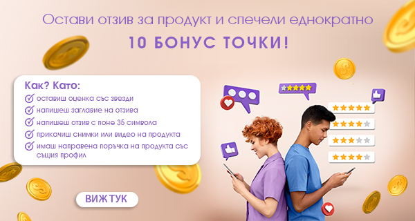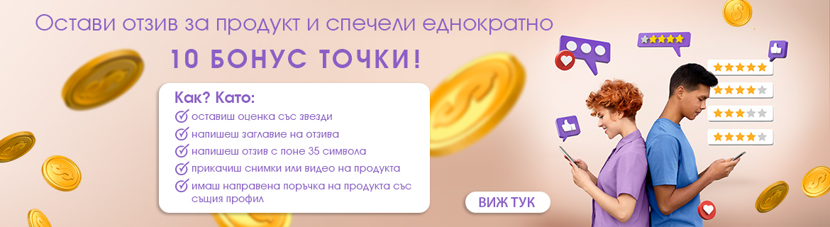- След проверка от администратор на сайта и одобрение за публикуване на потребителската оценка, потребителят може да бъде възнаграден еднократно с 10 бонус точки за първия си одобрен отзив на продукт от сайта. Тяхната стойност може да бъде използвана като паричен еквивалент при следваща онлайн поръчка на сайта (1 точка = 1 € / 1,96 левa).