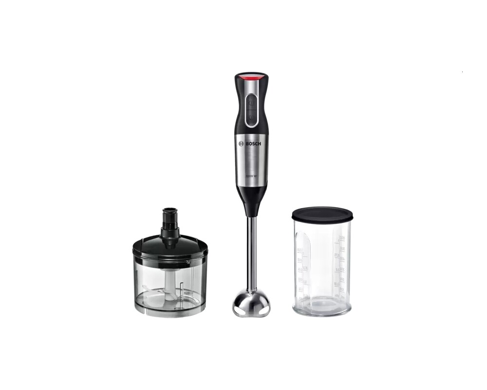 Максимална мощност на Bosch 1000 вата: за обработка на най-твърдите съставки и задвижване на много приставки. QuattroBlade: осигурява оптимално действие на рязане и фини резултати на смесване - с функция AntiSplash. Ергономично и удобно блендиране със стил: корпус от неръждаема стомана с мека на допир дръжка за сигурно сцепление. Променлива скорост: 12 настройки на скоростта плюс турбо функция за перфектна последователност на всяка рецепта. Чопър: нарязва билките, ядките, сиренето много по-бързо и лесно.