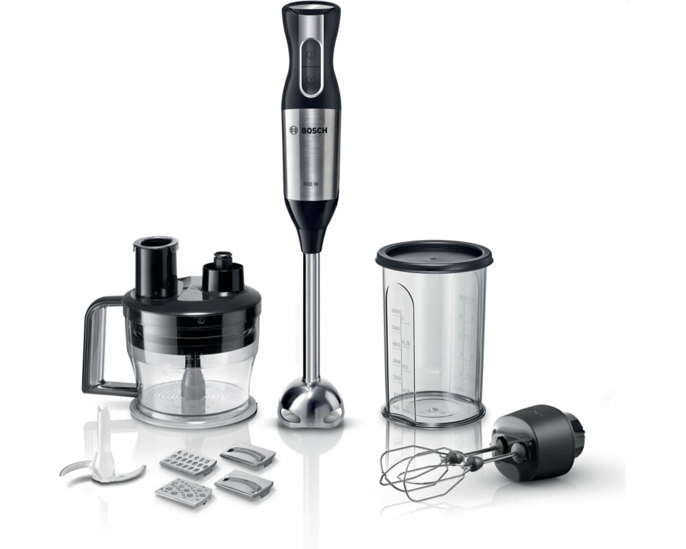 Изненадващо лесно с Bosch ErgoMixx: перфектни резултати, оптимален комфорт. QuattroBlade: осигурява оптимално действие на рязане и фини резултати на смесване - с функция AntiSplash. Ергономично и удобно блендиране със стил: корпус от неръждаема стомана с мека на допир дръжка за сигурно сцепление. Променлива скорост: 12 настройки на скоростта плюс турбо функция за перфектна последователност на всяка рецепта. Включен кухненски робот: кухненски помощник „всичко в едно“ за кълцане, настъргване и нарязване. Двойна бъркалка: За ефективно смесване и разбиване на смес за торта, пандишпаново тесто и бита сметана