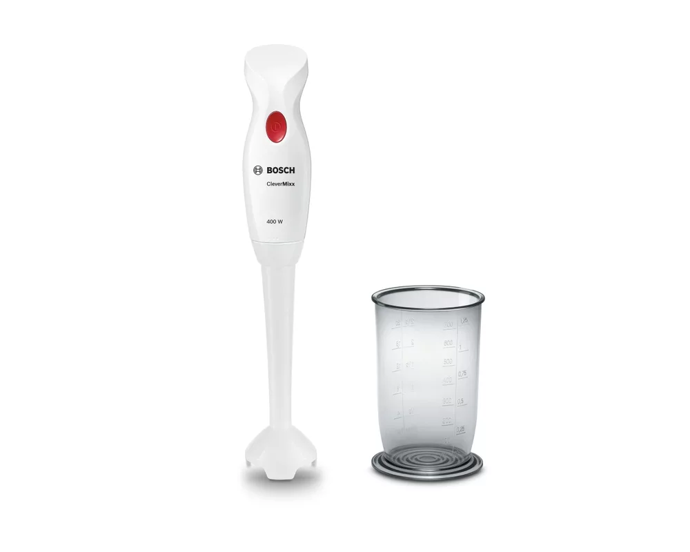 CleverMixx на Bosch: всестранният талант за повече удоволствие в кухнята. Миксира и пюрира перфектно за кратко време - с мощни 400 W. С включена калибрирана купа: просто отмервате желаното количество и миксирате директно в купата. CleverMixx - лека категория с нов дизайн: много лесно пюриране, шейкване и рязане чрез ергономична дръжка. За лесно пюриране и миксиране, без неприятно пръскане: нов миксиращ накрайник. Миксиращият накрайник и аксесоарите могат да се миятлесно и бързо в съдомиялна.