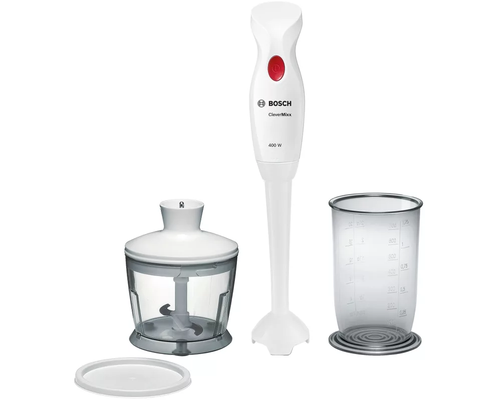 CleverMixx на Bosch: всестранният талант за повече удоволствие в кухнята. Миксира и пюрира перфектно за кратко време - с мощни 400 W. CleverMixx - лека категория с нов дизайн: много лесно пюриране, шейкване и рязане чрез ергономична дръжка. Билки, пармезан, ядки и други твърди съставки лесно и бързо: приставка с чопър. За лесно пюриране и миксиране, без неприятно пръскане: нов миксиращ накрайник. С включена калибрирана купа: просто отмервате съставките и миксирате директно в купата. Накрайникът и аксесоарите могат да се мият в съдомиялна.