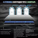 - PAC копозитен филтър - филтрира замърсители с големи частици като утайка, ръжда, хлор и други.- 100 G Мембранен филтър за обратна осмоза - Обратната осмоза е най-качествената към момента технология за пречистване на водата, която се използва от производителите на напитки, храни и лекарства в цял свят. При този процес водата се пропуска под налягане през полупропусклива мембрана, която пропуска само молекулите на водата и отстранява всякакви микроорганизми, бактерии и вируси, хормони, тежки метали, антибиотици, пестициди и други опасни вещества. Осмотичната мембрана има микроскопични пори и не пропуска солите на твърдостта (калций и магнезий), заради които се появява котления камък, поради което обратната осмоза е най-ефикаснит метод за пречистване на твърда вода. Чрез обратната осмоза се филтрират замърсители по-малки от 0,001 микрометър, което прави методът до 5000 пъти по-ефективен от обикновените филтри за вода.