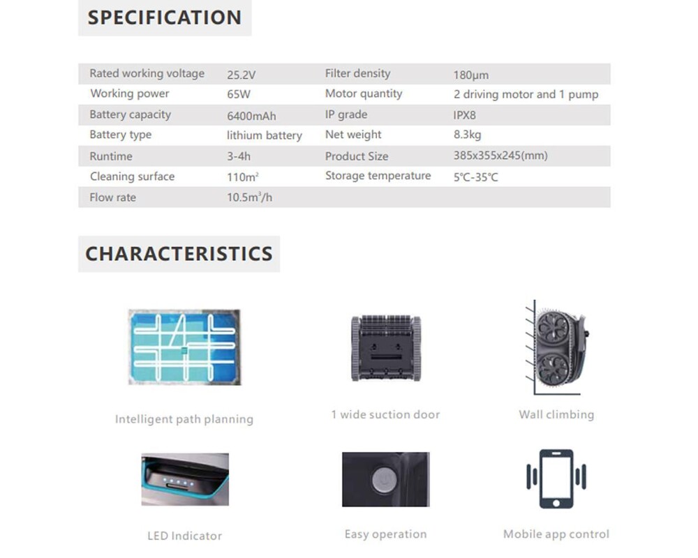 Безкабелният робот за почистване на басейни Wybot S1 притежава следните харектеристики: