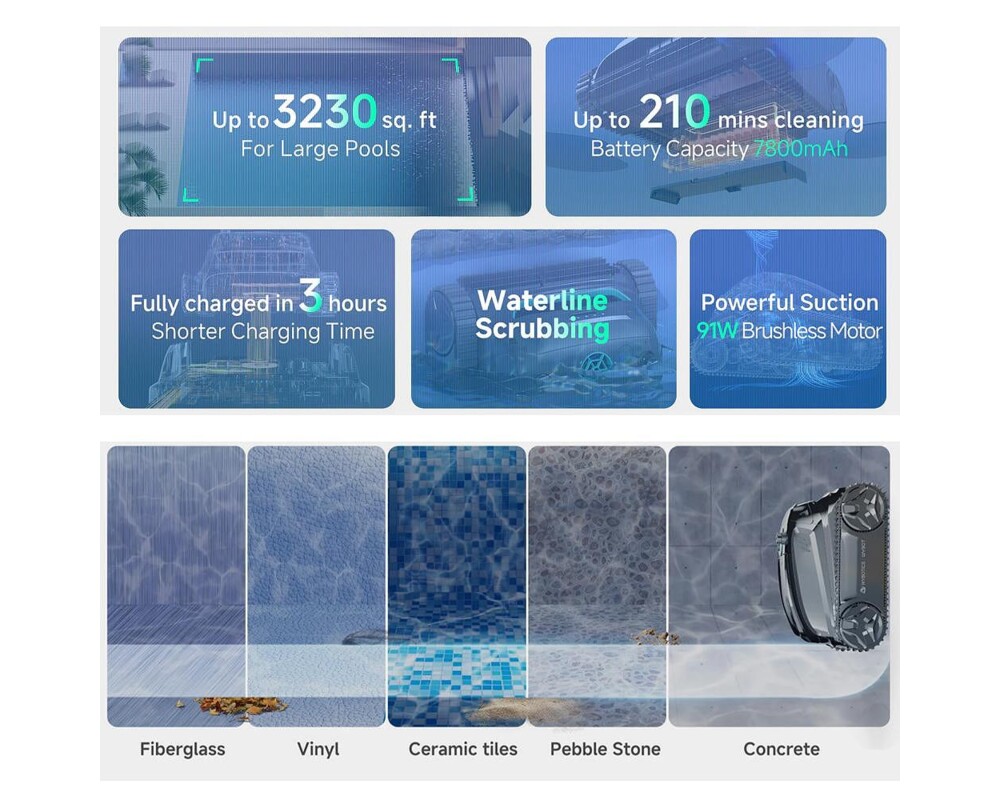 Безкабелният робот за почистване на басейни Wybot S2 притежава следните харектеристики: