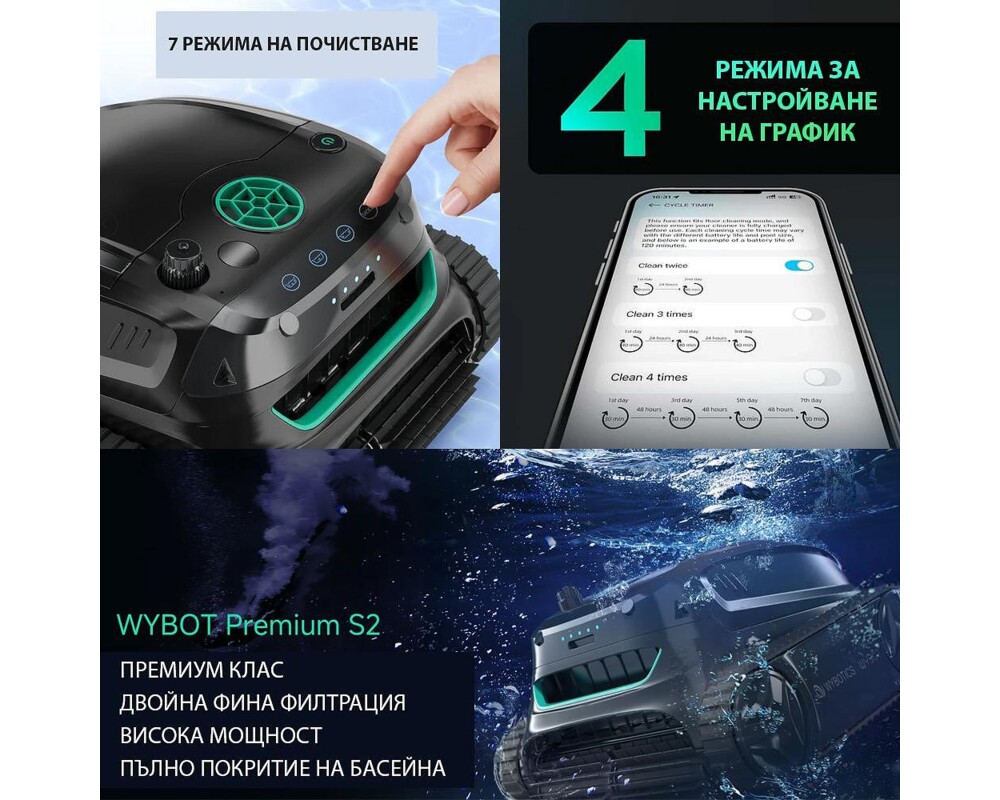 Wybot S2 е премиум клас робот, който ще Ви осигури безкомпромисно почистване с максимална ефективност, незаменимо удобство и впечатляващи резултати!