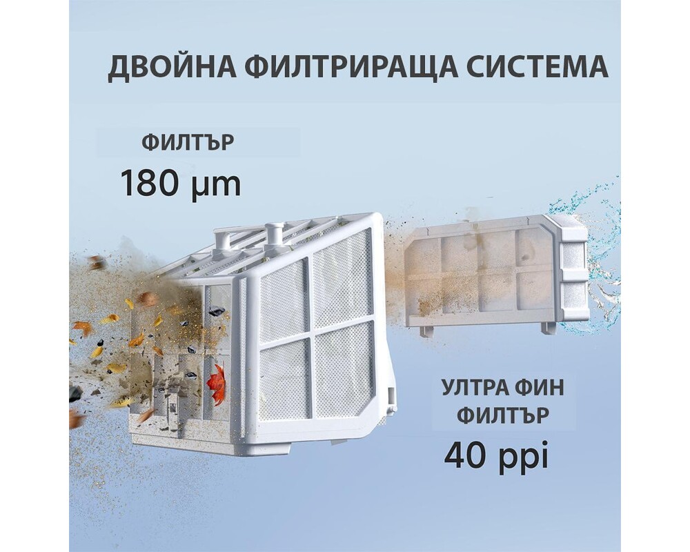 - Двойно филтриране: филтър 180μm + ултра фин филтър 40 ppi