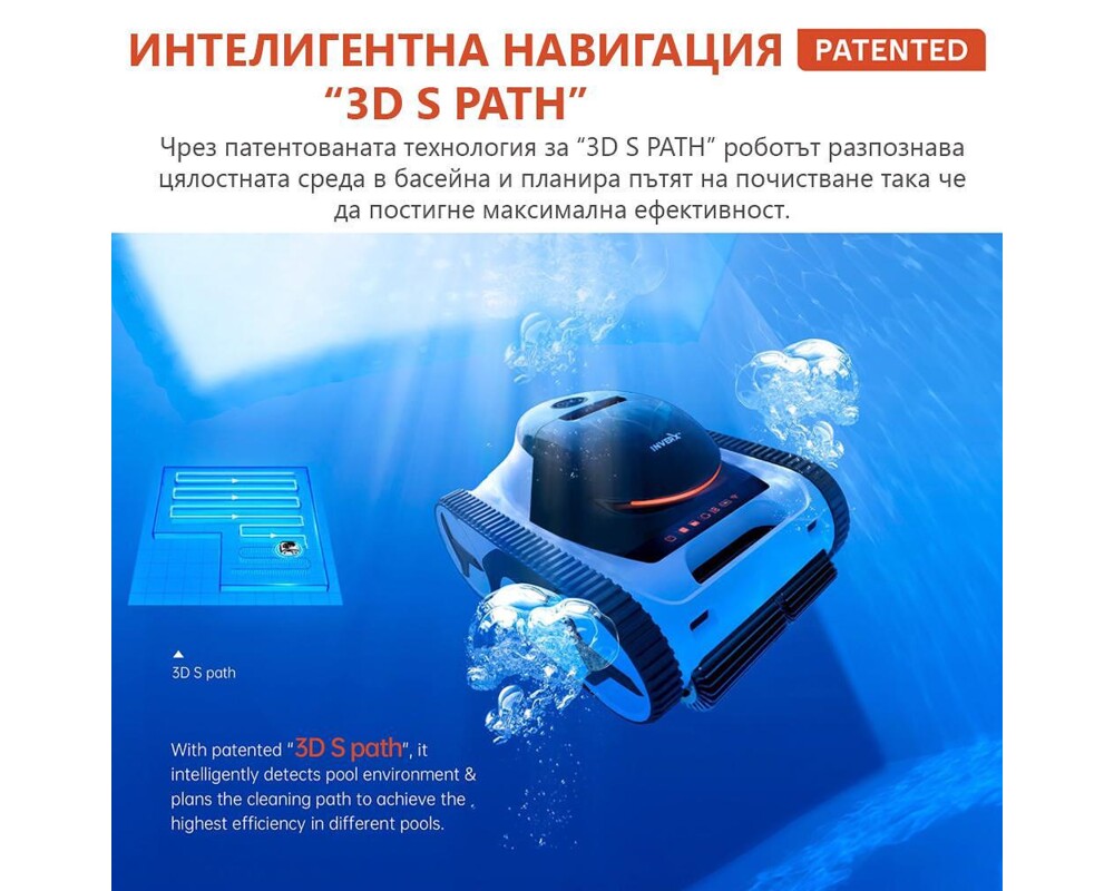 - ИНТЕЛИГЕНТНА НАВИГАЦИЯ "3D S Path" - Чрез патентованата технология за “3D S PATH” роботът разпознава цялостната среда в басейна и планира пътят на почистване така че да постигне максимална ефективност.