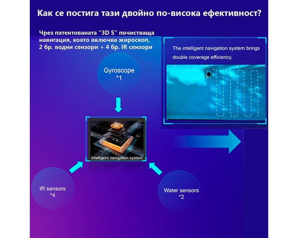 Патентованата “3D S” почистваща навигация включва жироскоп, 2 бр. водни сензори + 4 бр. инфраред сензори: