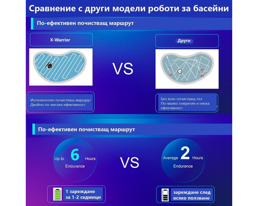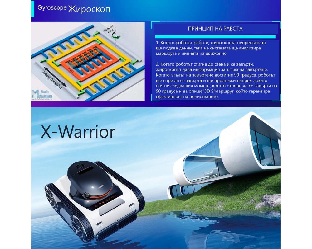 Интелигентния робот за почистване на басейни от ново поколение X-Warrior X60 ще ви осигури бързо, лесно и удобно поддържане на чистотата на водата във вашия басейн! Защо този робот за басейн ще се превърне във Вашия незаменим съюзник за поддържане на чистотата, защото притежава следните функции: