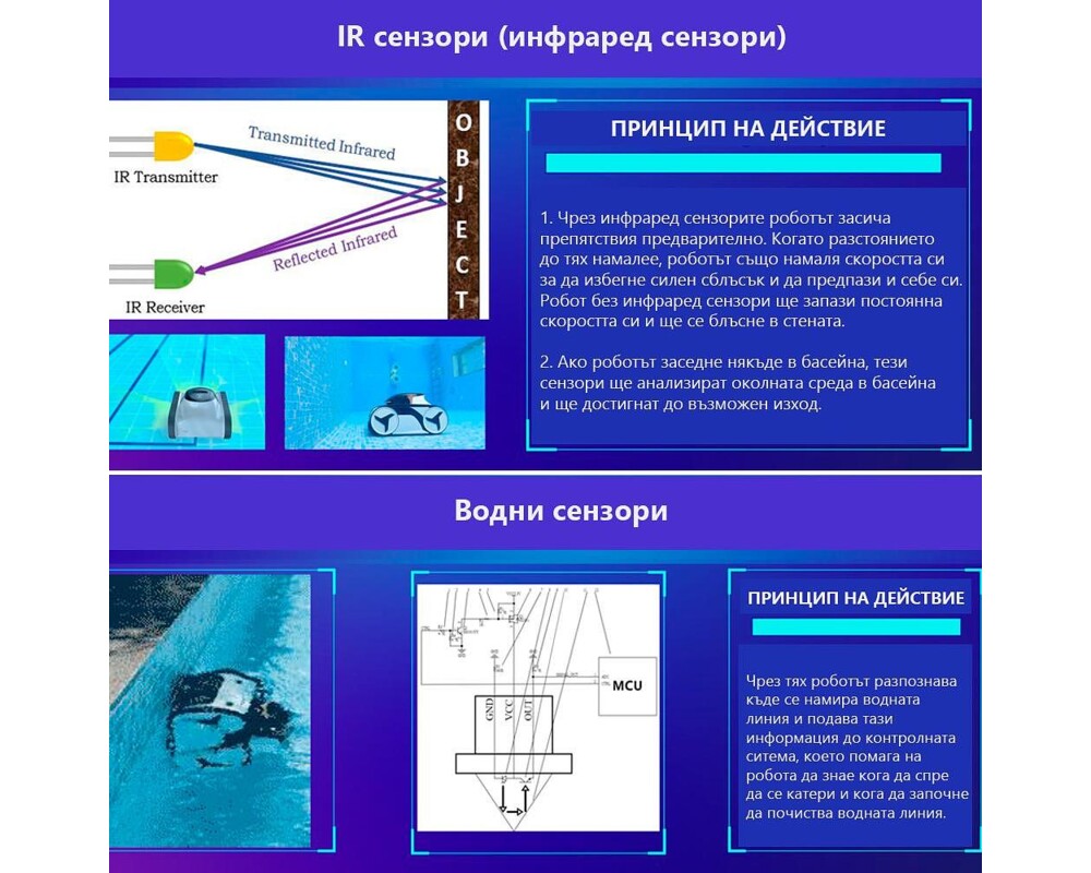 - IR сензори - Чрез инфраред сензорите роботът засича препятствия предварително. Когато разстоянието до тях намалее, роботът също намаля скоростта си за да избегне силен сблъсък и да предпази и себе си. Робот без инфраред сензори ще запази постоянна скоростта си и ще се блъсне в стената. Ако роботът заседне някъде в басейна, IR сензорите ще анализират околната среда в басейна и ще достигнат до възможен изход.