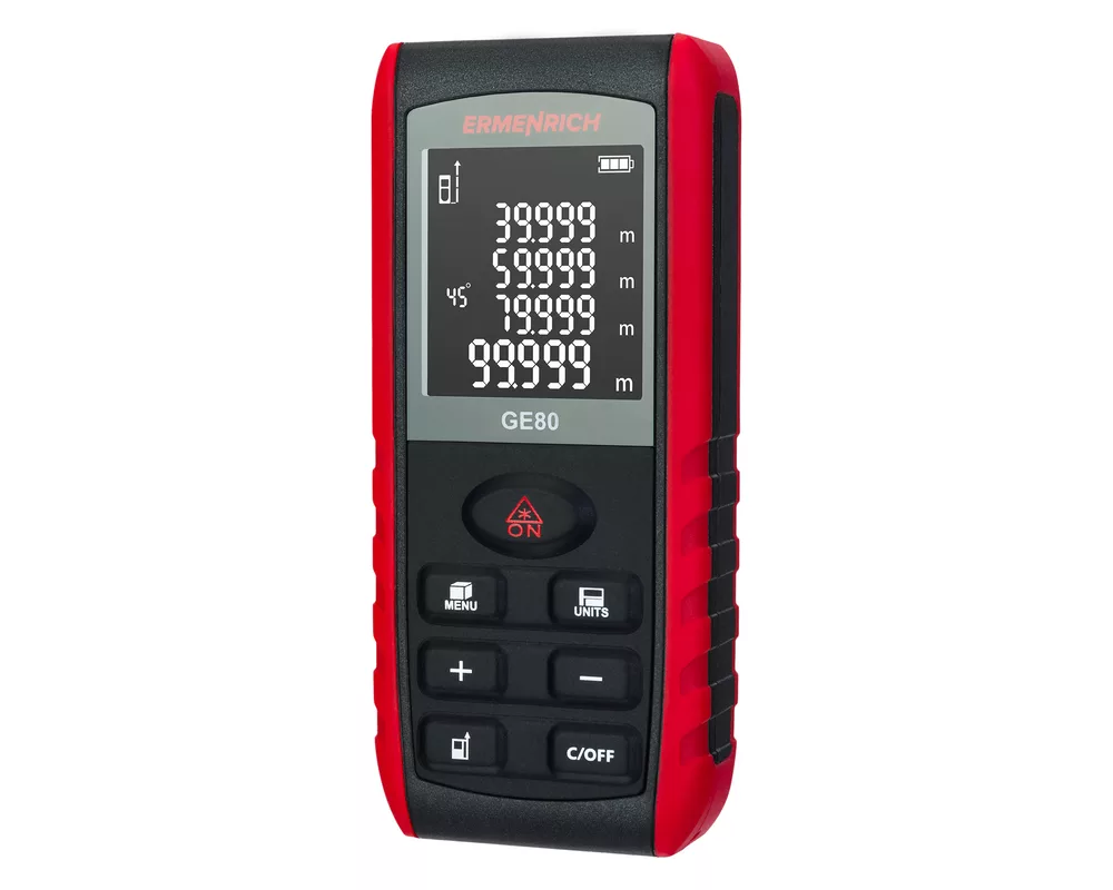 <p>Лазерният измерител Ermenrich Reel GE80 е универсален измервателен инструмент, който е полезен за много инженерни, строителни, ремонтни и битови задачи. Той Ви предоставя възможност не само да измервате точно дължина, но така също да изчислявате обем, площ и ъгли. Добавена е функция с използване на Питагоровата теорема, ако не може да бъде измерено разстоянието по права линия (например при наличие на препятствия по пътя на лазерния лъч). В този случай уредът извършва изчисления на базата на междинни измервания.</p>