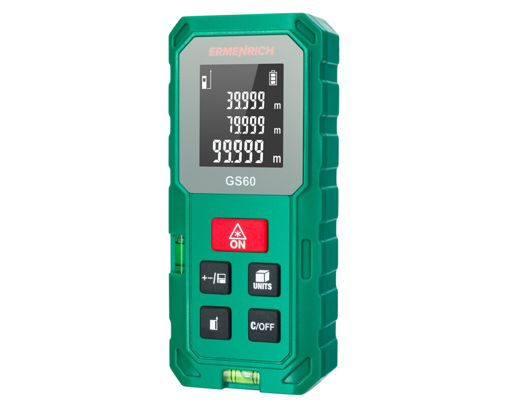 <p>Ermenrich Reel GS60 е модерен лазерен измерител за извършване на измервания в строителството, инженеринга, земемерството, ремонта и много други области. Той Ви предоставя възможност за точно измерване на разстоянието и линейните размери на помещения и обекти, тяхната площ и обем. Функцията с използване на Питагоровата теорема Ви предоставя възможност за автоматично изчисляване на разстоянието с помощта на междинни измервания, ако уредът не може да се постави на желаното място.</p>