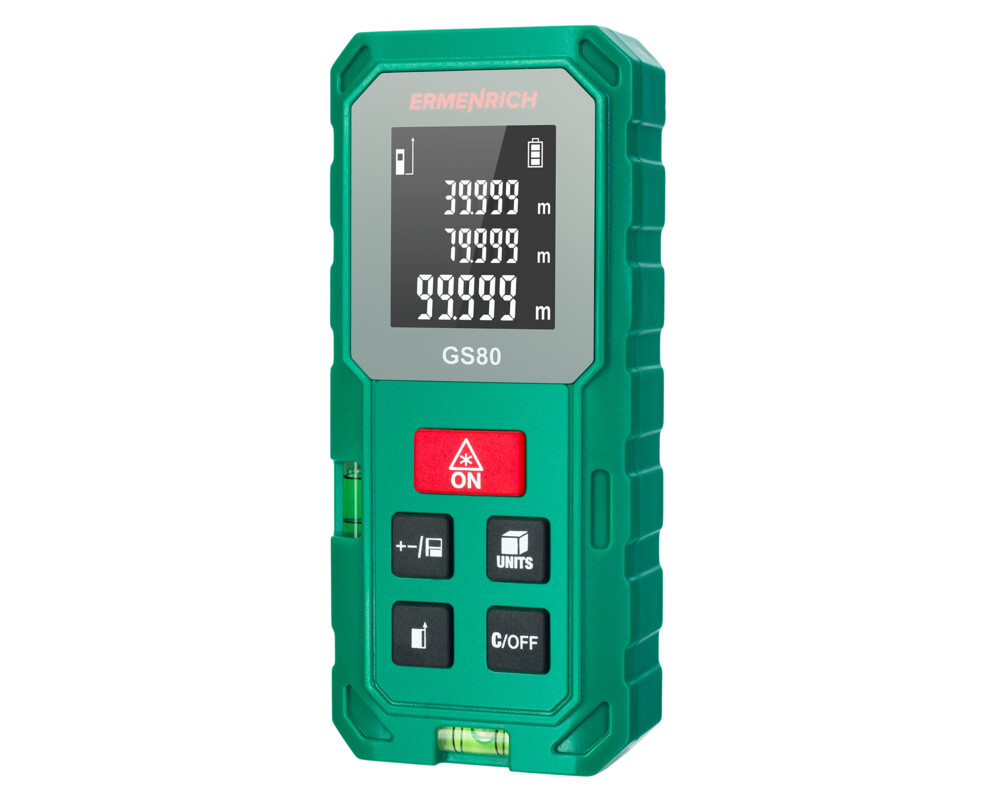 <p>Лазерният измерител Ermenrich Reel GS80 е предназначен за измервания при строителни или ремонтни работи. Неговата функционалност е едно от неговите основни предимства. Той Ви предоставя възможност не само за определяне на разстояния и линейни размери на обекти, но и за изчисляване на площ и обем. Функцията с използване на Питагоровата теорема помага за изчисляване на разстоянието между две точки с помощта на индиректни измервания. Два хоризонтални нивелира с мехурче Ви позволяват да нивелирате уреда, за да направите измерванията колкото е възможно по-точни.</p>