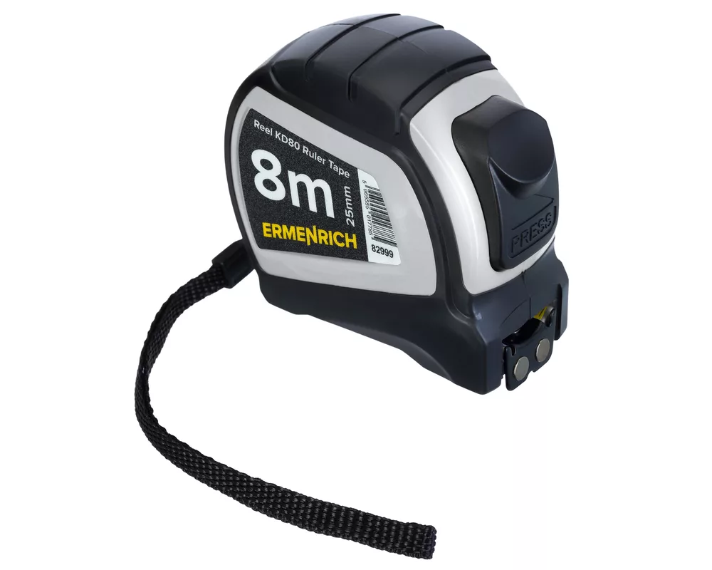 8-метровата Ermenrich Reel KD80 е класическа ролетка, конструирана за точни измервания. Тя е идеална за строителни и ремонтни задачи, дизайн, преподреждане на мебели и различни битови задачи. Направена е от здрави и дълготрайни материали, с матирана стоманена лента и гумиран корпус от пластмаса ABS.
