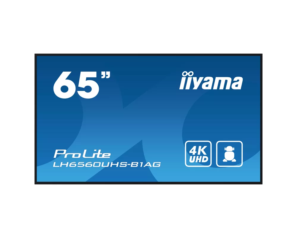 Дисплей IIYAMA LH6560UHS-B1AG, 64,5'', VA Panel, AG, 3H, 16:9, 4K UHD 3840x2160, 500cd/m2, 5000:1, 6,5ms, Thin bezel, Android 11 OS, iiSignage2, EShare, WiFi, CPU: A53*4, 2GB, 16GB, 24/7, Media playback, Portrait, 3x HDMI, RS232, LAN, IR, 2x USB, Speakers, VESA, Wall mounting kit included, Black
