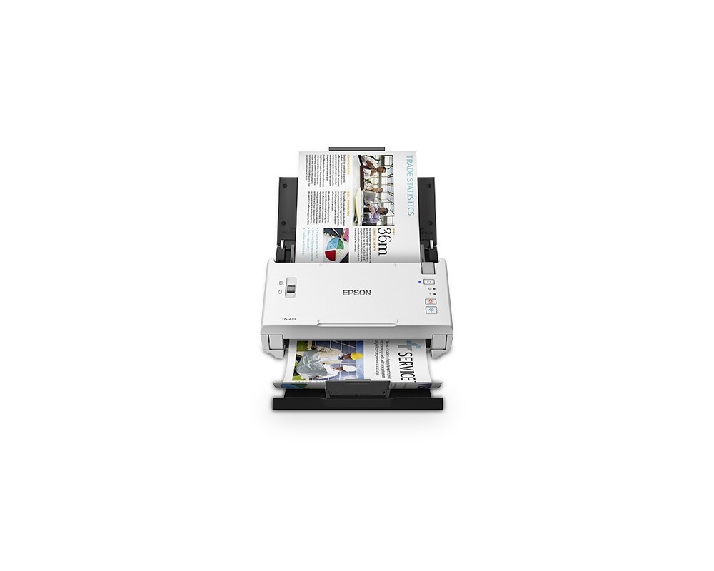 Epson WorkForce DS-410 ви осигурява бързо и ефикасно сканиране на достъпна цена. Той има малки и компактни размери, които го правят идеален за работа в малки офис пространства и у дома. Този скенер има редица функции, които ви помагат да работите безпроблемно. Една от тях е технологията за защита на оригиналните документи, която прекратява сканирането автоматично в случаи на разместена хартия или неправилно поставена хартия. Освен това скенерът разполага със защита, която предотвратява сканирането на две страници едновременно. Epson WorkForce DS-410 разполага с механизъм, който подава до 50 бр. страници за сканиране автоматично, като по този начин ви гарантира отлична скорост дори при сканиране на големи по обем документи. Той сканира до 26 страници на минута и разполага с режим, който ви позволява да сканирате и по-големи документи с размер А3.
