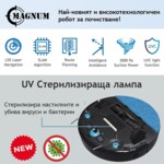 Прахосмукачката робот MAGNUM UV+ е най-новият представител на серията роботи за почистване MAGNUM. Това е изключително интелигентен робот, който съчетава харектеристики от най-висок клас - лазерна система за навигация, приложение на български език с богат набор от функции, UVC лампа за стерилизация на почистената повърхност, сухо и мокро почистване, висока всмукателна мощност, централна четка + 2 странични четки, Y-образно движение при мокро почистване и още много иновативни качества!