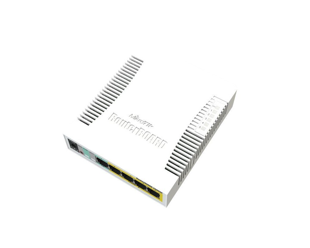 RB260GSP е малък комутатор за дома и малкия офис, който е способен да подава захранване от своите Еthernet портове.