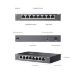 - 8× 10/100/1000Mbps RJ45 портове с автоматично договаряне, поддържащи Auto-MDI/MDIX