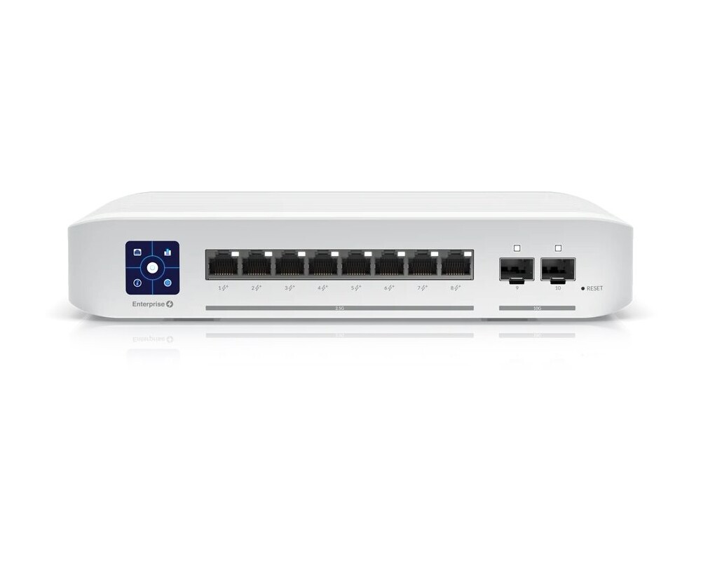 UniFi Switch Enterprise 8 PoE е надежден управляем 2,5-гигабитов L3 комутатор с комутационен капацитет от 80 Gbps, (8) 2,5-гигабитови LAN порта и два SFP+ (10 Gbps) слота. Всички Ethernet портове поддържат 802.3af/at PoE-Out с изходна мощност от 30 W/порт и общ PoE бюджет от 120 W. В допълнение към стандартното оборудване, комутаторът разполага и с 1,3" сензорен екран за предоставяне на информация за система, температура, статистика на портовете, PoE захранване и много други.Суичът може да се захранва чрез стандартно 230 V и максимална консумация на енергия е 150W.