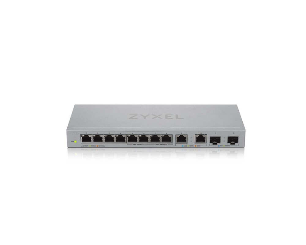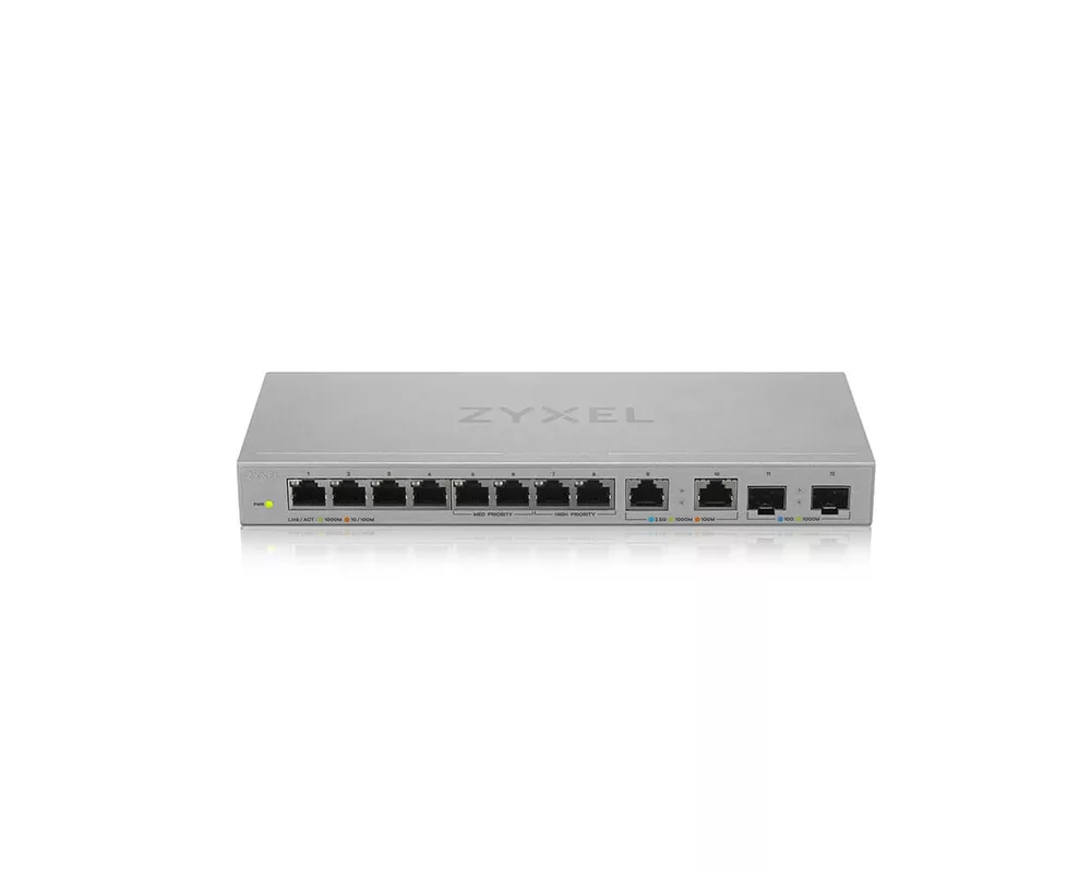 Zyxel XGS1010-12 е висококачествен комутатор, който идва с осем гигабитови Ethernet порта, два 2,5 гигабитови порта и два 10 гигабитови SFP+ uplink порта. Този комутатор има стилен дизайн и отлични размери, които ви гарантират, че ще се впише във всяко помещение безпроблемно. Ако пожелаете, имате възможността да свържете 802.11ac или 802.11ax точки за достъп към 2,5 Gigabit портовете за истинска максимална безжична скорост. Доставяйте данните си бързо до вашите клиентски устройства от вашия NAS, работни станции или други основни мрежи с 10 Gigabit SFP+. Zyxel XGS1010-12 е специално проектиран за клиенти, които се нуждаят от лесно управление на различни смесени среди от дома до офиса. Той се вписва идеално в домове и офиси със своя компактен размер, като същевременно осигурява висока производителност без никакъв шум.