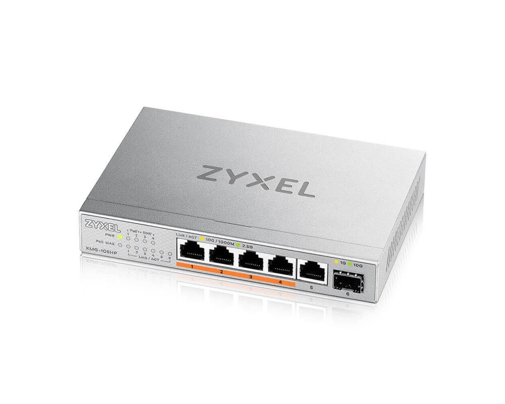 - Суич ZyXEL XMG-105 5 портов 2,5Gb + 1xSFP+, 4 порта 70W PoE++, неуправляем (ID: 766536)