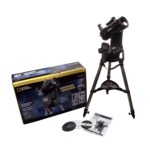 Bresser National Geographic 90/1250 GoTo Telescope with a Maksutov-Cassegrain optical design and an auto-tracking system produces sharp, crisp, and high contrast images. To start observations, place the instrument on a tripod or any flat surface, press the button, and the telescope will point at the object on its own. The computer-controlled mount database stores coordinates of 272.000 celestial objects. With such a great feature, you do not need to spend much time on navigation and will be able to start your observations almost immediately after unpacking the box.