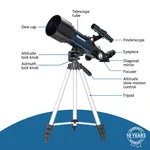 С Levenhuk Discovery Sky Trip ST70 се работи лесно: оптична тръба е монтирана на азимутална монтировка, която Ви позволява да местите тръбата нагоре и надолу и от ляво надясно. Телескопът се предлага с много принадлежности: леща на Барлоу, окуляри с различно фокусно разстояние, оптичен визьор, диагонална призма и адаптер за смартфон. Можете да регулирате увеличенията, за да изследвате красотата на космоса и да правите снимки, за да запечатате резултатите от своите наблюдения. Алуминиевият триножник с регулируема височина лесно се настройва към Вашата височина.