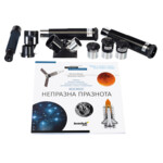 Едно от предимствата на модела е екваториалната монтировка с органи за управление за бавно движение. Тя ще Ви помогне да се справите с прецизното насочване и проследяване на обекти. Що се отнася до оптиката, тя е ахроматична, т.е. при нея няма изкривяване на цветовете, което се среща често при рефракторите. Лещите са покрити с антирефлексно покритие, а изображението е ясно и чисто. Можете да правите наблюдения с различни фокусни разстояния. Наборът включва три окуляра, диагонално огледало, окуляр с директно изображение за наземни наблюдения и мощна леща на Барлоу.