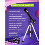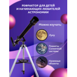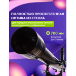 Всички лещи на телескопа са произведени от оптично стъкло и са защитени с антирефлексно покритие. Оптиката осигурява контрастни, отчетливи и чисти изображения. Луната е прекрасна при максималното увеличение: можете да наблюдавате дори нейни кратери с диаметър по-голям от 8 км. Оптичен визьор с увеличение 5x Ви позволява да се насочвате бързо към астрономически обекти. За прецизно насочване се използва класическа азимутална монтировка. Тази монтировка осигурява възможност за лесно движение на оптичната тръба по осите. Дори дете може да работи с този телескоп.