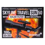 Телескопът Levenhuk Skyline Travel Sun 50 е компактен и лек оптичен инструмент с оптика от качествено стъкло. Този универсален модел също е подходящ и за прости наблюдения на планетите от Слънчевата система, на наземните обекти, на Луната и на Слънцето (само със специален филтър). Този телескоп позволява да се наблюдават слънчевите петна на повърхността на слънцето. Трябва да бъдете много внимателни, когато наблюдавате Слънцето. Винаги проверявайте дали соларният филтър е добре закрепен към тръбата на телескопа. Филтърът трябва да покрива изцяло апертурата. Никога не гледайте към Слънцето и към ярката част на небето около него чрез оптичния визьор.