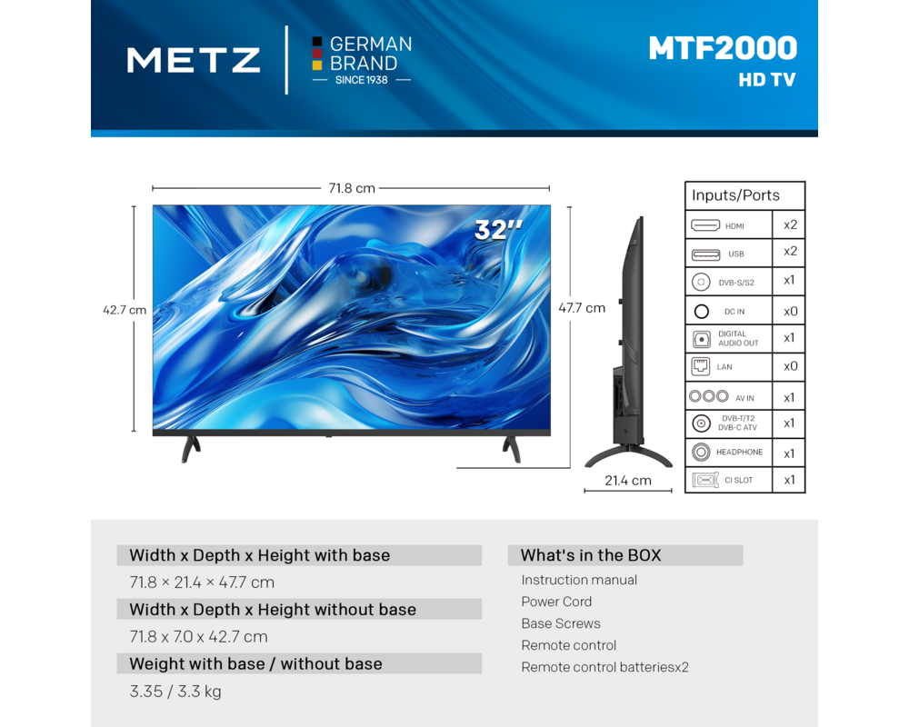 Телевизор METZ Телевизор 32" LED HD TV 1366x768, 2x10W 32MTF2000Z