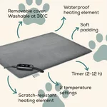 Overheating protection Protected heating element: Scratch-resistant and waterproof (IPX7) Instruction on care: Cover machine washable at 30°C Additional safety due to low voltage: Current voltage reduced to 12V |