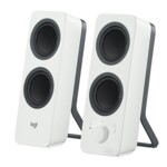 such as your smartphone or tablet and/or connect one device such as your computer with a wired connection seamlessly switching between the two to watch videos and listen to music. 5 Watts RMS/10 Watts Peak power delivers room-filling sound from the four-driver design; two drivers create the perfect balance between the mid and high tones while two passive radiators deliver bass.Stream audio wirelessly from up to two Bluetooth devices or connect one device via the 3.5mm input. The Logitech Easy-Switch technology lets you seamlessly switch between audio sources-just pause the audio on one and press play on the other. Easily access the Bluetooth pairing button power volume and the headphone jack located on the right speaker.Bluetooth version: 4.1 Reliable 20-meter line of sight range1 x 3.5mm input 1 x headphone jackPackage Contents: Two speakers 3.5 mm audio cable User documentationDimensions (HxWxD): 241 x 90 x 124 mm |
