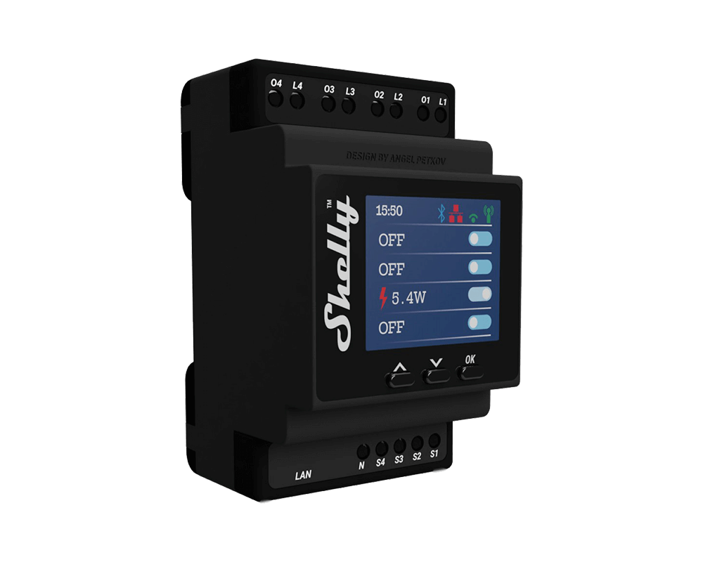 Четворно Wi-Fi реле Shelly Pro 4PM - разполага с 4 изхода до 16A всеки и максимално до 40А общо. Подходящо е за автоматизация на електроуреди в дома и офиса и за наблюдение, контрол и измерване на консумацията на енергия. Поддържа LAN и Bluetooth. Монтира се на DIN - шина. Има подобрени функции за безопасност спрямо стандартните WiFi релета и е съвместимо с повечето използвани платформи за домашна автоматизация. Разполага с 1.8 инчов цветен екран с бутони за навигация.